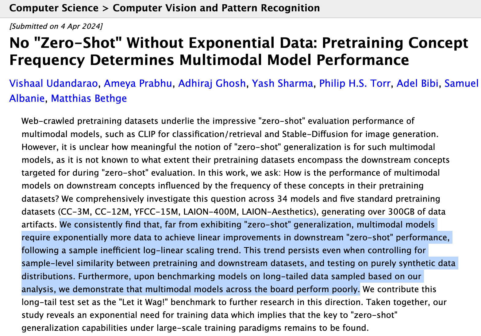 “Our research looked into how well advanced models, trained on vast internet data, can understand and respond to new tasks without prior specific training. We discovered that these models, contrary to expectations, require significantly more data to slightly improve at these new tasks, showing a slow and inefficient learning process. This inefficiency persists even under varied testing conditions, including completely new or closely related data to their training. Moreover, when faced with a broad range of uncommon tasks, the models performed poorly. Our findings challenge the notion of “zero-shot” learning—where models instantly adapt to new tasks without extra training—highlighting a gap in their supposed ability to learn efficiently from large datasets.”