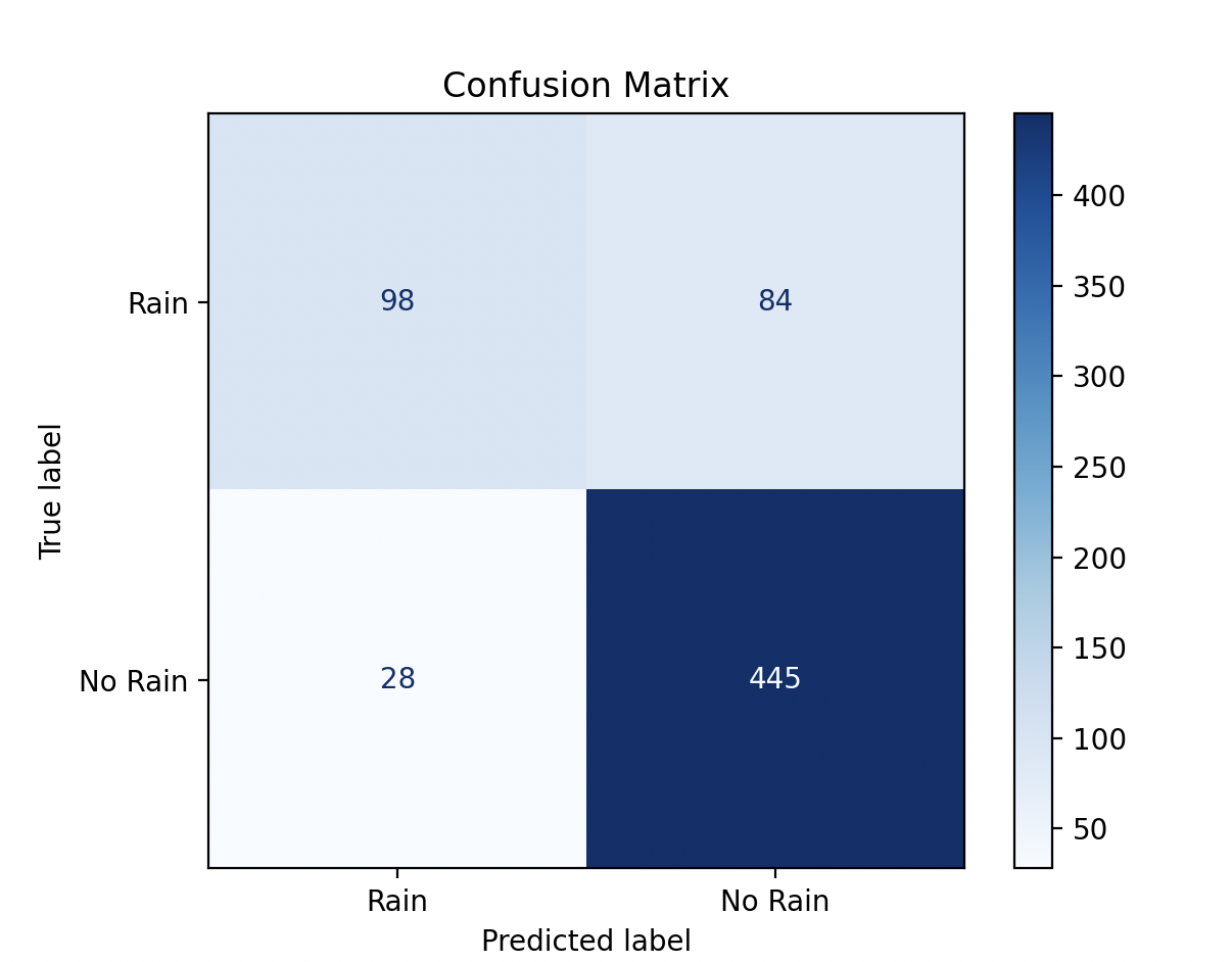 - Bottom Right (True Negatives): the model correctly predicted that it would not rain in 445 cases.