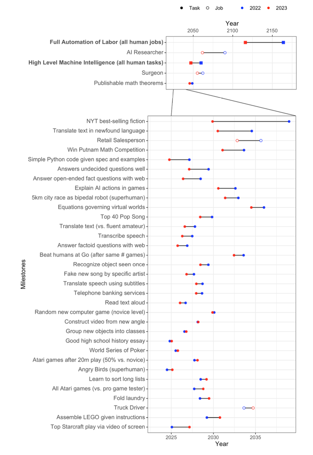 The figure below from the survey shows the expected automation dates for various tasks, occupations, and two human-level performance measures. Each circle or square marks the year with a 50% chance of automation, while the intervals show the 25% to 75% probability range.
