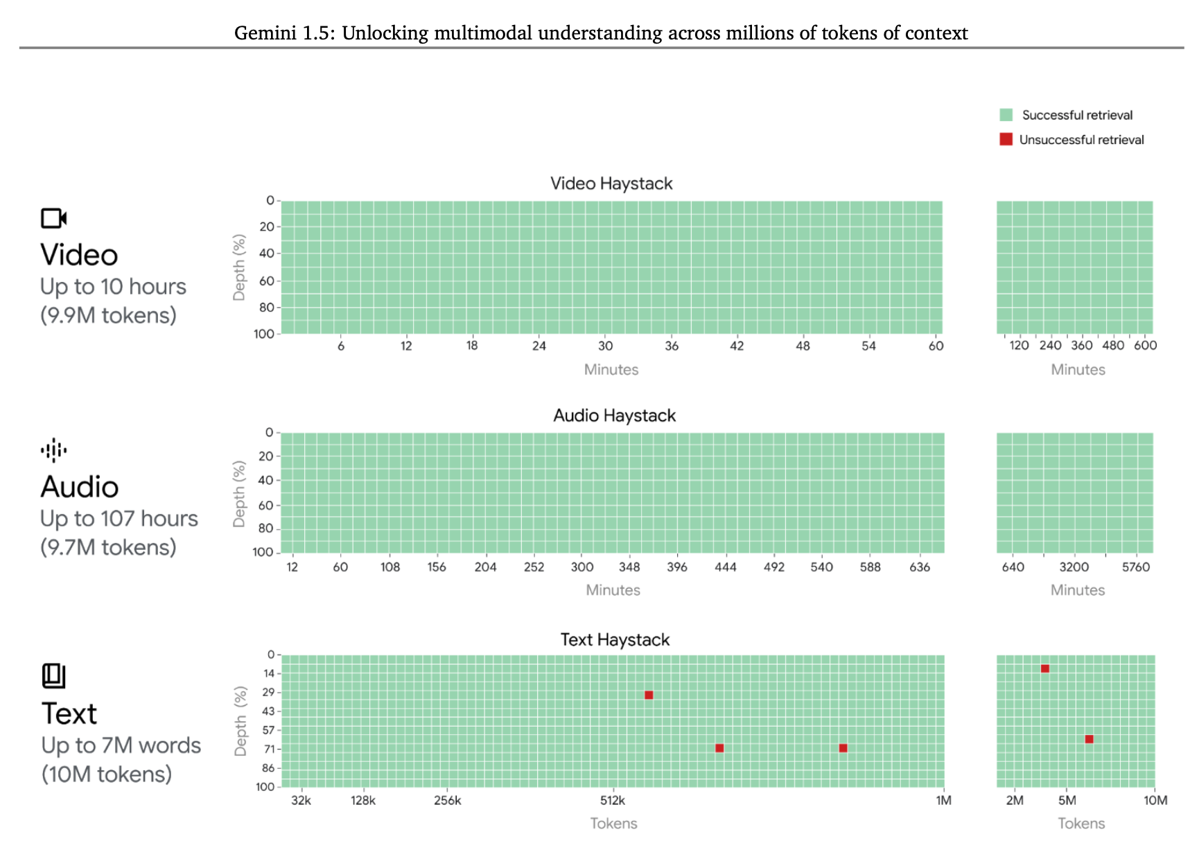 How much further can we go? Today, I was perusing this Google paper and it turns out that their research team can achieve a 10 million token context window Gemini 1.5! Not just that, but as you can see in the charts below from the June 2024 update of the paper, the model achieves almost perfect recall across the equivalent of 7 million words or up to 107 hours of audio or 10 hours of video. These are incredibly impressive results!