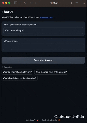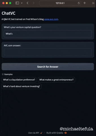 There were broadly three steps. First I used an open source Python library called BeautifulSoup to extract all the text from https://avc.com/. Second, I created an AI-native database of that text using Chroma. This part is really cool because Chroma stores the text in a highly multi-dimensional space where related concepts can be found easily. Finally, I used Langchain to connect to OpenAI’s GPT model for chat and language capabilities. (The user interface is powered by Gradio.)